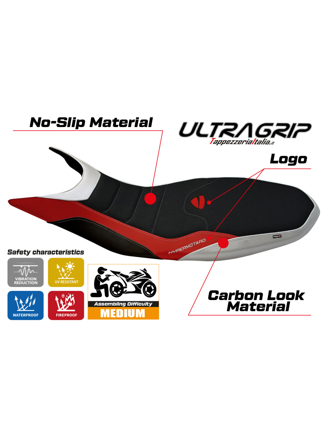 Bringen Sie Ihre Ducati Hypermotard 821/939 auf ein neues Niveau von Kontrolle, Sicherheit und Stil mit dem UltraGrip-Sitzbankbezug von Tappezzeria Italia!
