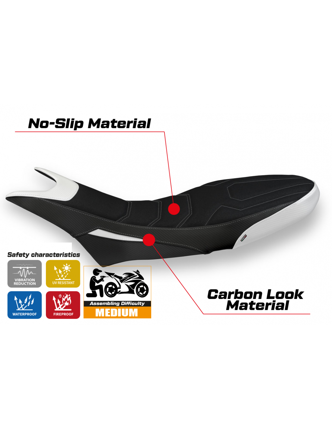 Der UltraGrip-Bezug verfügt über eine sehr raue Oberfläche, die speziell entwickelt wurde, um das Rutschen des Fahrers auf dem Sitz zu minimieren. Besonders nützlich beim Beschleunigen, Bremsen und in Kurven, um eine stabilere und sicherere Position auf dem Motorrad zu gewährleisten. - Perfekt für sportliches Fahren und Rennstrecken