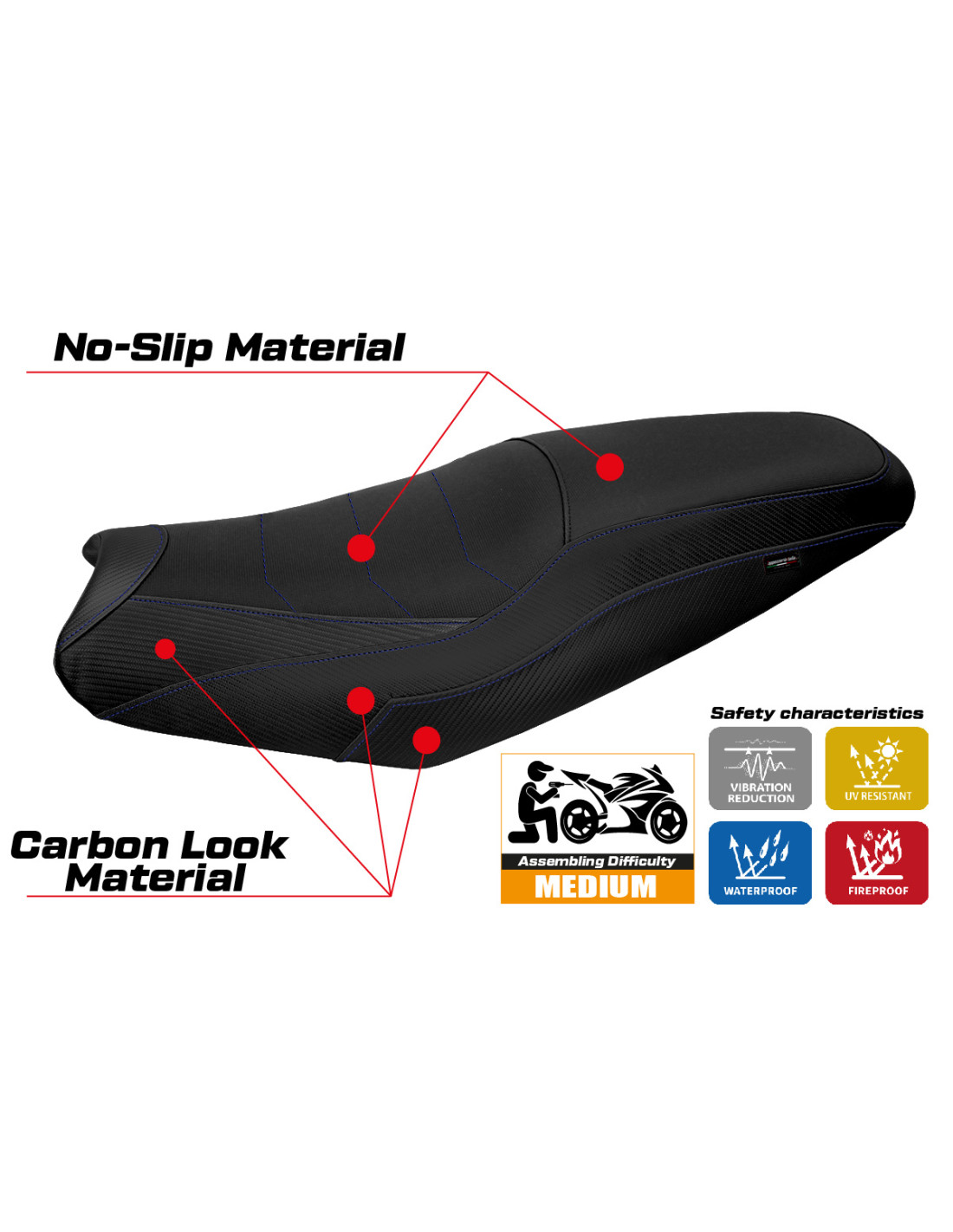 Die Sattelbezüge von Tappezzeria Italia werden aus 100% PVC-Technikmaterialien in Marinequalität hergestellt und mit verschiedenen Texturen wie Carbon-Look, Cordura, Wildleder, Leder und mehr bedruckt. Sie sind speziell dafür konzipiert, die Griffigkeit und den Stil deutlich zu verbessern.