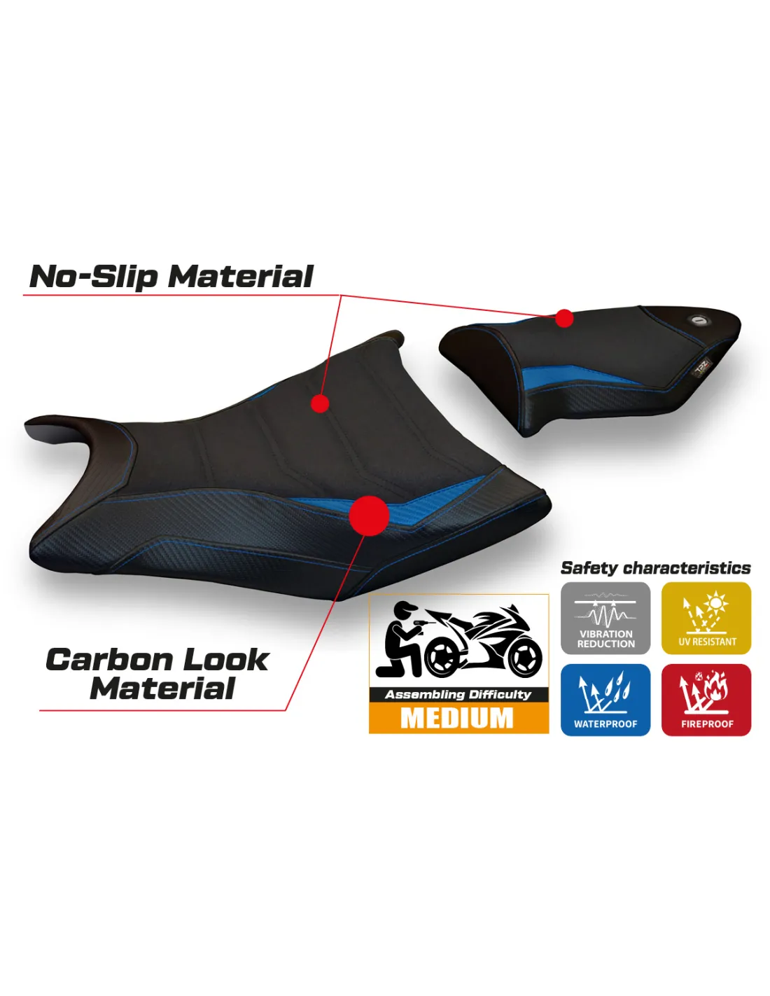 Der UltraGrip-Bezug verfügt über eine sehr raue Oberfläche, die speziell entwickelt wurde, um das Rutschen des Fahrers auf dem Sitz zu minimieren. Besonders nützlich beim Beschleunigen, Bremsen und in Kurven, um eine stabilere und sicherere Position auf dem Motorrad zu gewährleisten. - Perfekt für sportliches Fahren und Rennstrecken