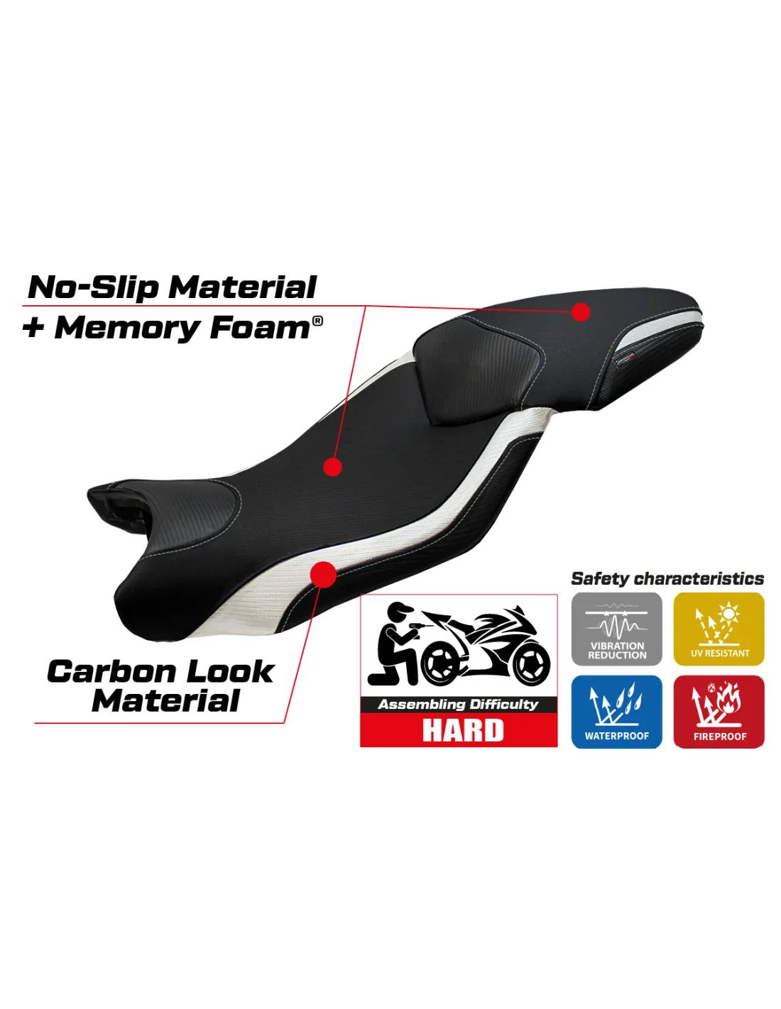 Der Sitzbezug wurde entwickelt, um eine perfekte Kombination aus Stil und Widerstandsfähigkeit zu bieten und eine stabilere und sicherere Fahrt unter allen Bedingungen zu gewährleisten.