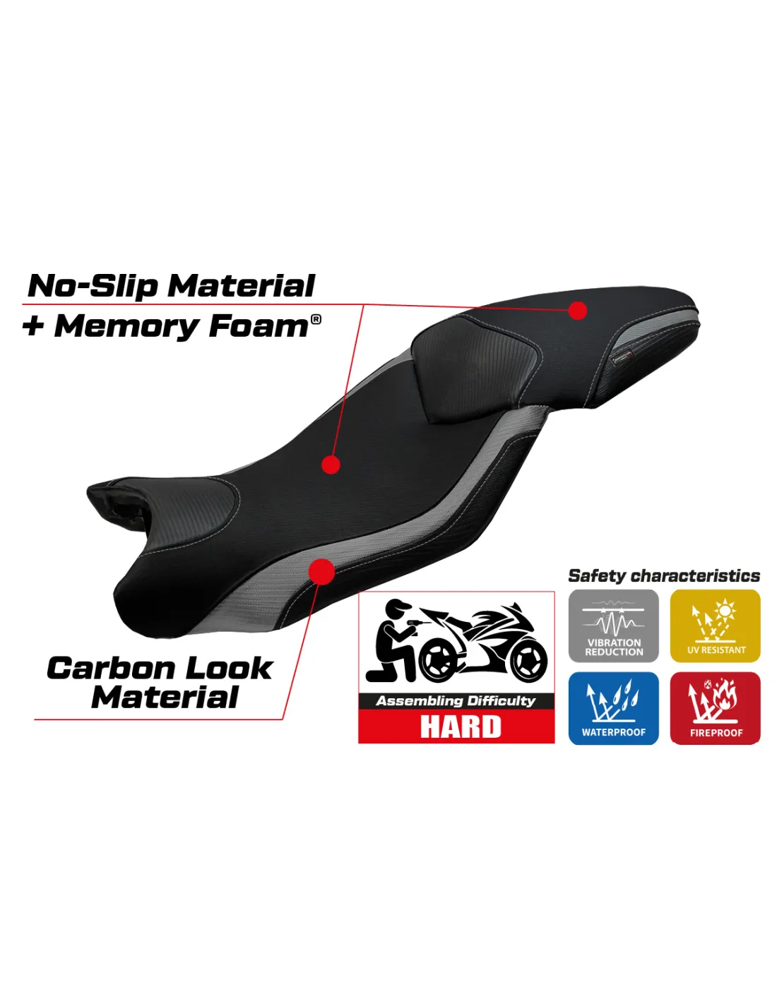 Der Sitzbezug wurde entwickelt, um eine perfekte Kombination aus Stil und Widerstandsfähigkeit zu bieten und eine stabilere und sicherere Fahrt unter allen Bedingungen zu gewährleisten.