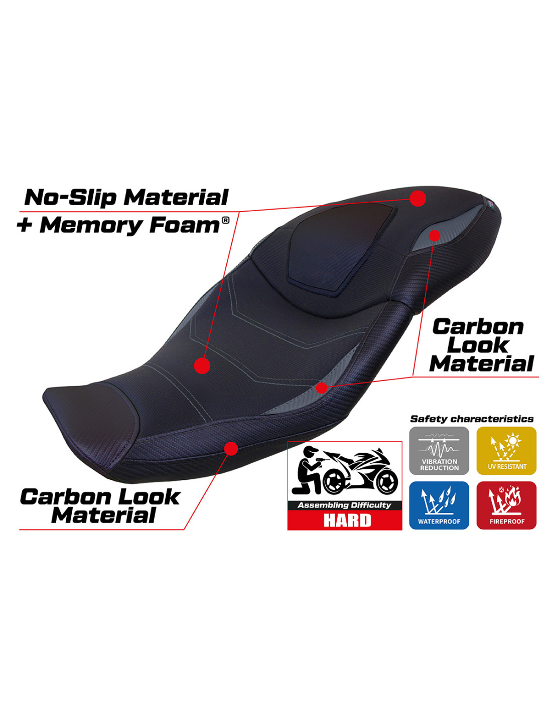 Der Sitzbezug wurde entwickelt, um eine perfekte Kombination aus Stil und Widerstandsfähigkeit zu bieten und eine stabilere und sicherere Fahrt unter allen Bedingungen zu gewährleisten.