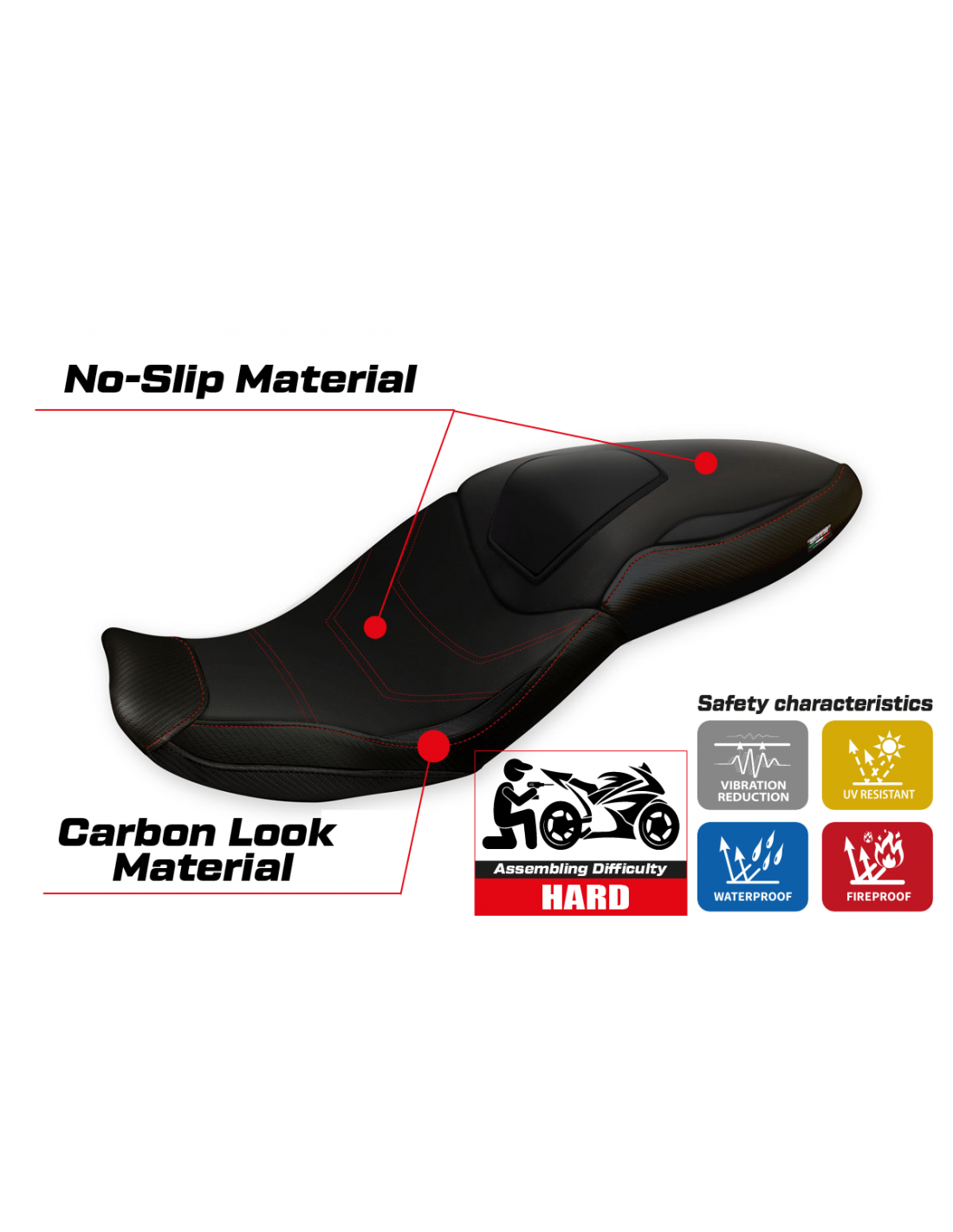 Die Sattelbezüge von Tappezzeria Italia werden aus 100% PVC-Technikmaterialien in Marinequalität hergestellt und mit verschiedenen Texturen wie Carbon-Look, Cordura, Wildleder, Leder und mehr bedruckt. Sie sind speziell dafür konzipiert, die Griffigkeit und den Stil deutlich zu verbessern.
