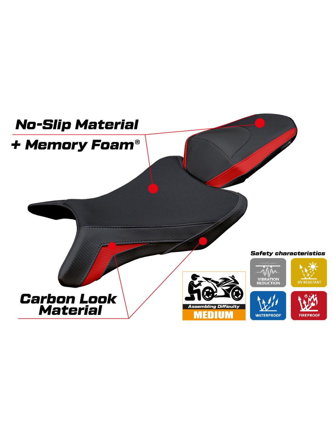 La funda del asiento se combina con una espuma de látex especial, que proporciona una amortiguación extra. Este material es conocido por su capacidad de absorber vibraciones, distribuyendo uniformemente el peso del piloto sobre el asiento. El resultado es una reducción de la presión en los puntos de contacto, aumentando el confort incluso en viajes prolongados.