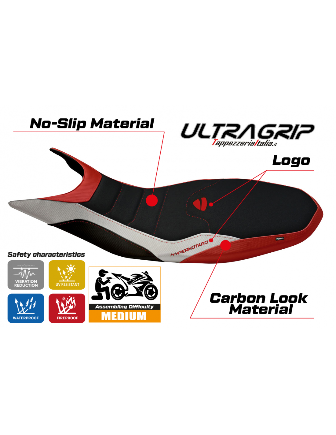 Lleva tu Ducati Hypermotard 821/939 a un nuevo nivel con la funda de asiento UltraGrip de Tappezzeria Italia!