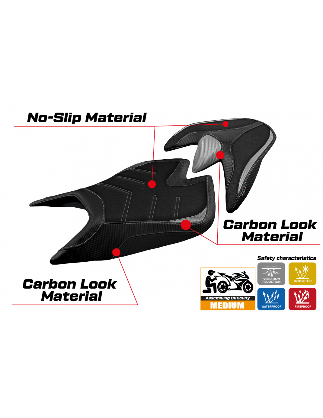 La funda de asiento está diseñada para ofrecer una combinación perfecta de agarre, durabilidad y estética deportiva y agresiva, asegurando una conducción más estable y segura en todas las condiciones.
