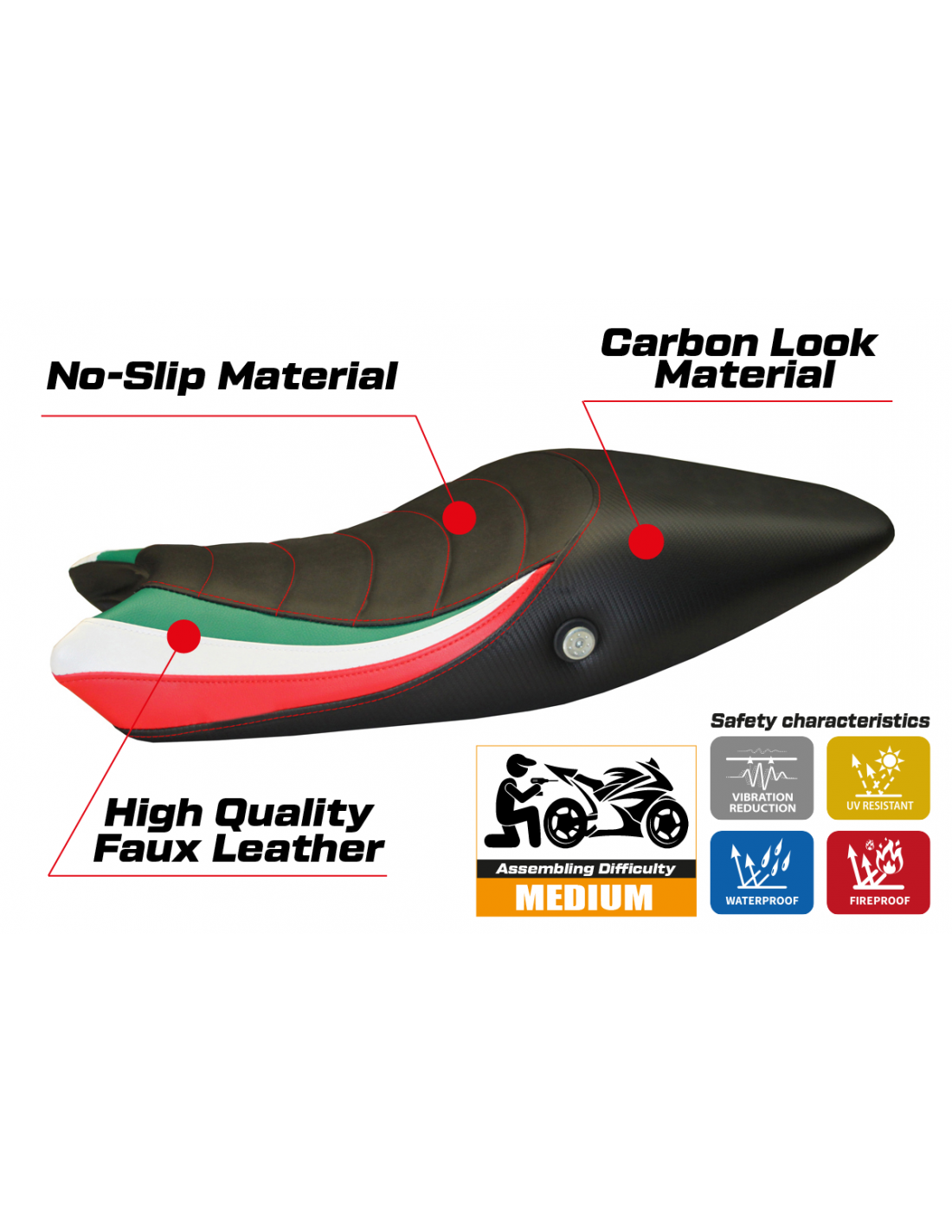 Les housses de selle Tappezzeria Italia sont fabriquées avec des matériaux techniques 100% PVC de qualité marine, imprimées avec différentes textures telles que l'effet carbone, cordura, cuir suédé, cuir et bien plus encore. Elles sont spécialement conçues pour offrir une adhérence et un style nettement améliorés.