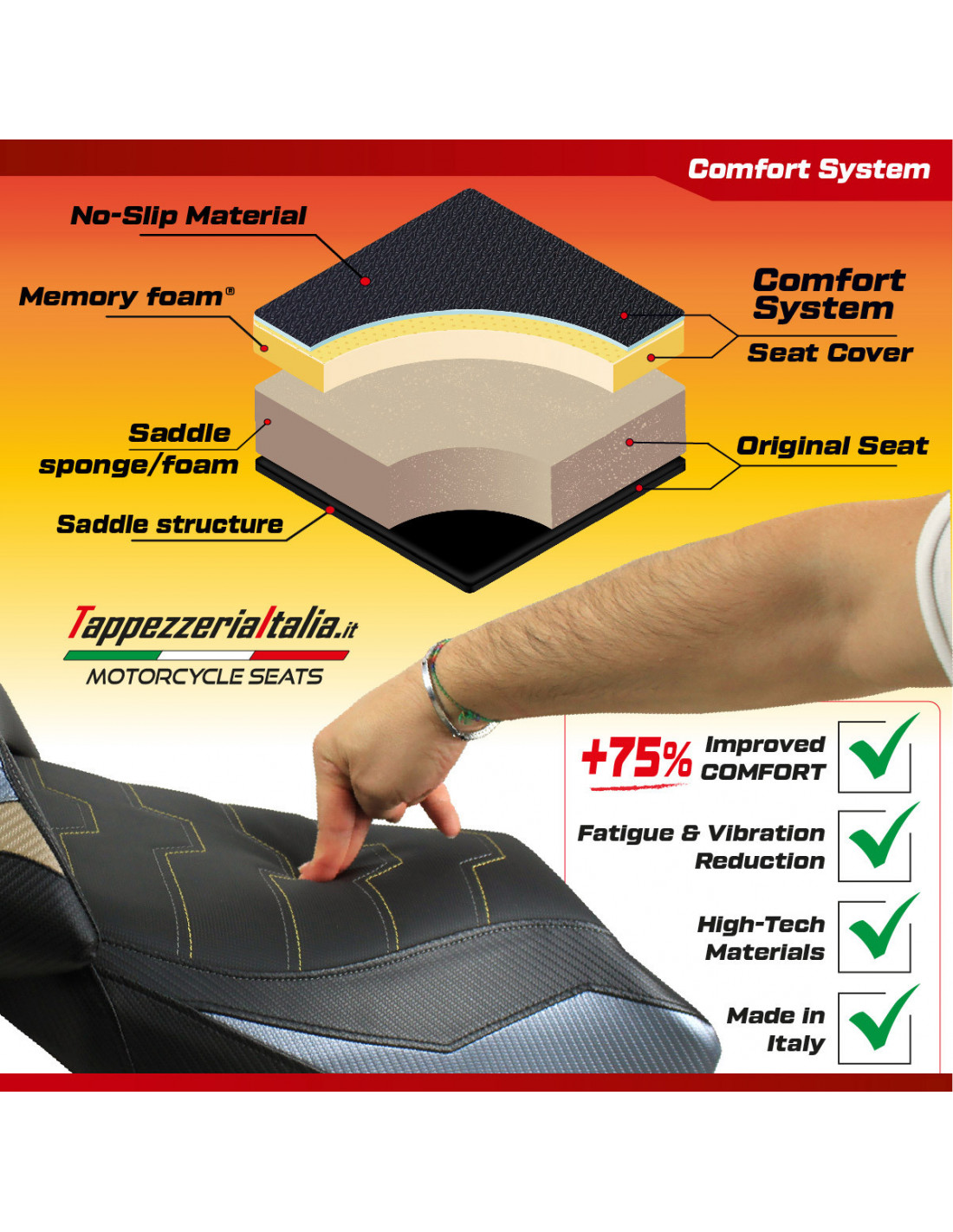 Designed to provide a superior riding experience, the Comfort System by Tappezzeria Italia is an exclusive technology developed to enhance riding comfort and reduce fatigue for both rider and passenger, especially on long journeys.