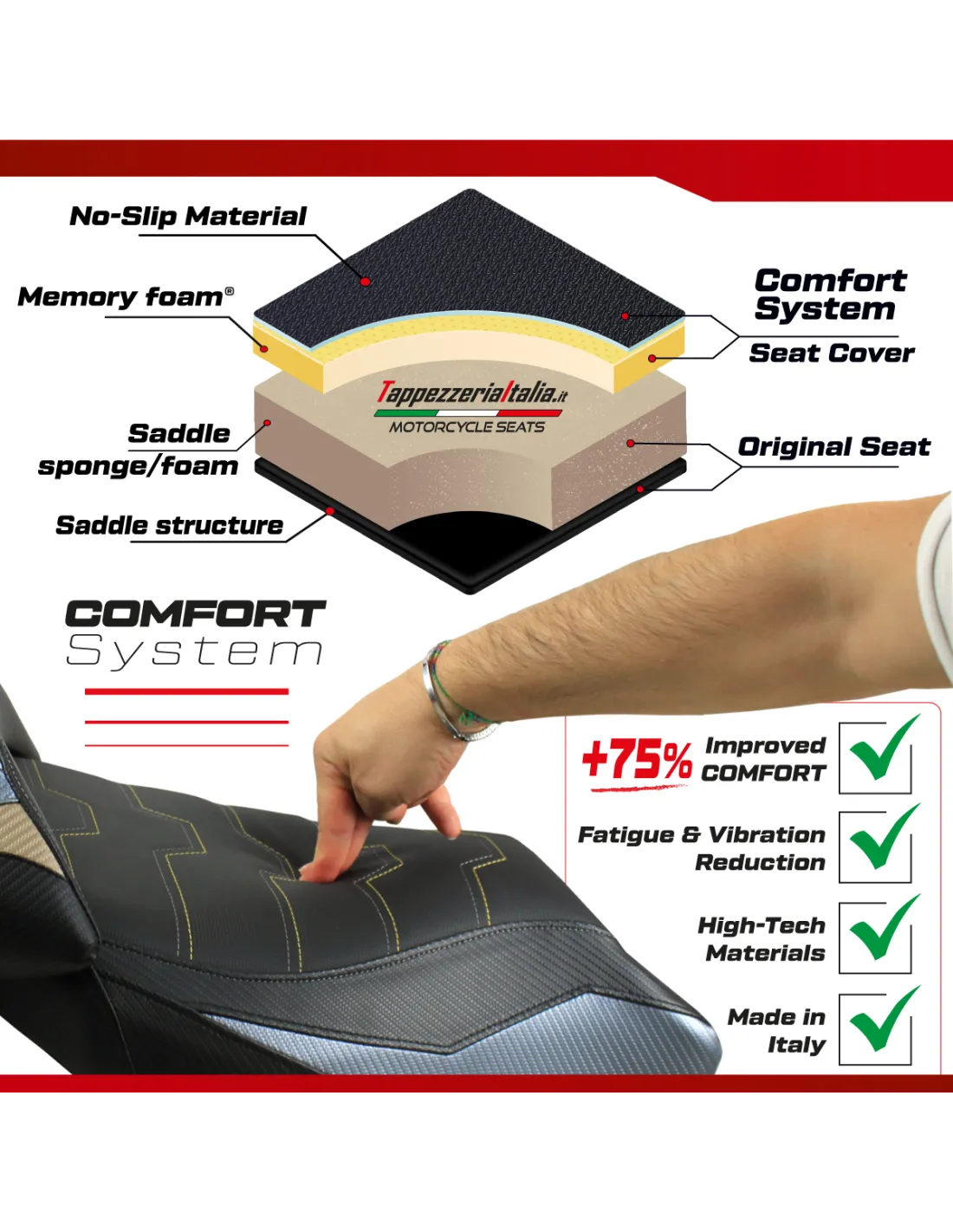 Designed to provide a superior riding experience, the Comfort System by Tappezzeria Italia is an exclusive technology developed to enhance riding comfort and reduce fatigue for both rider and passenger, especially on long journeys.