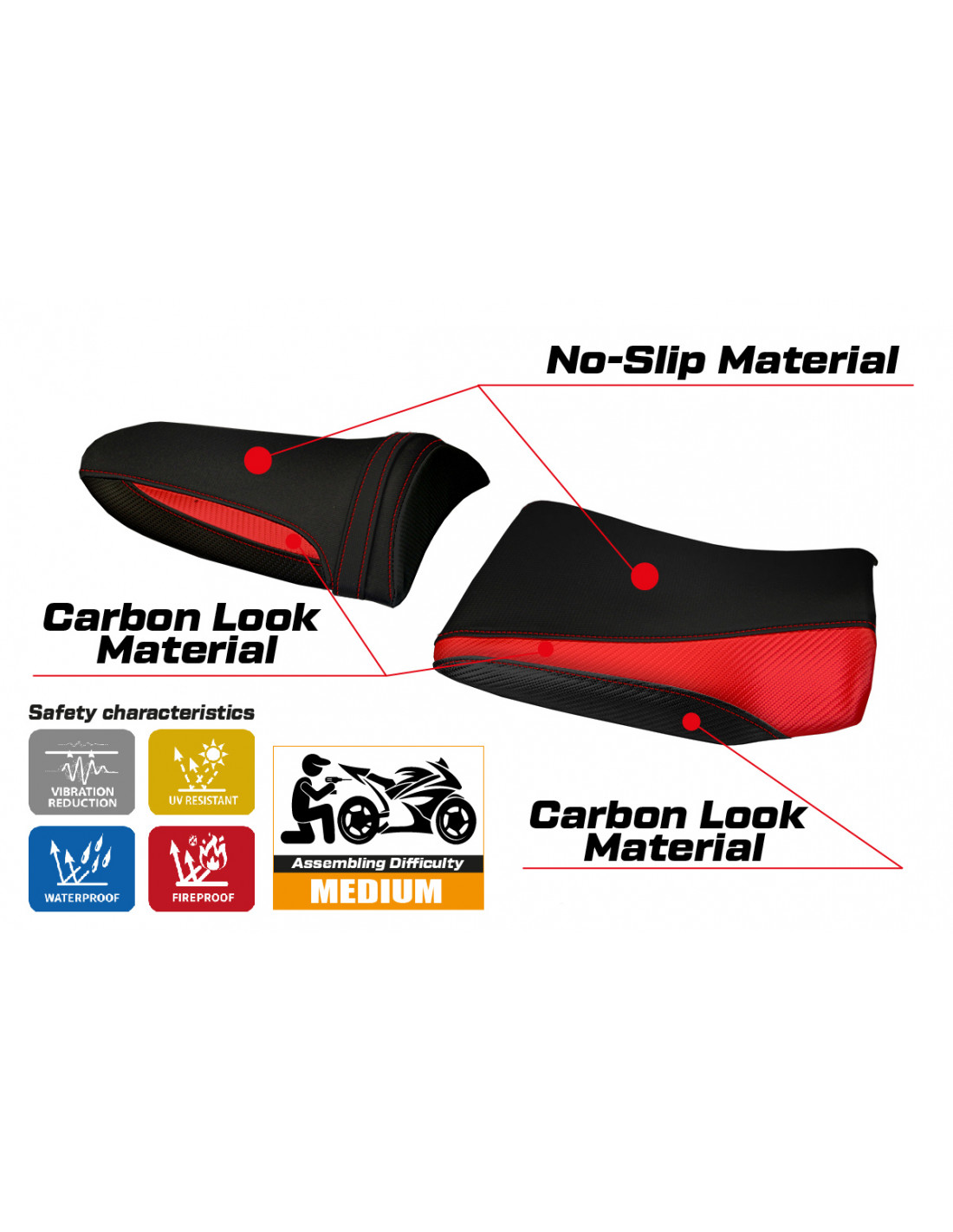 The Tappezzeria Italia seat covers are crafted from 100% PVC technical materials of marine quality, printed with various textures such as carbon look, cordura, suede leather, leather, and more. They are specifically designed for significantly enhanced grip and style.