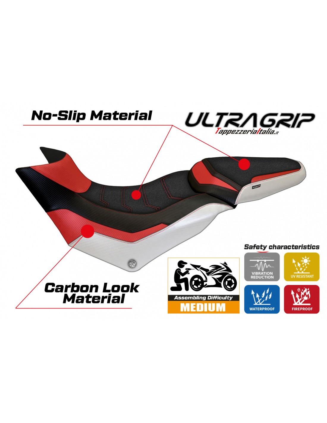 Il rivestimento UltraGrip è realizzato con una superficie estremamente ruvida al tatto, studiata per ridurre al minimo lo scivolamento del pilota sulla sella. Questo è particolarmente utile in accelerazione, frenata e nelle curve, garantendo una posizione più stabile e sicura sulla moto.