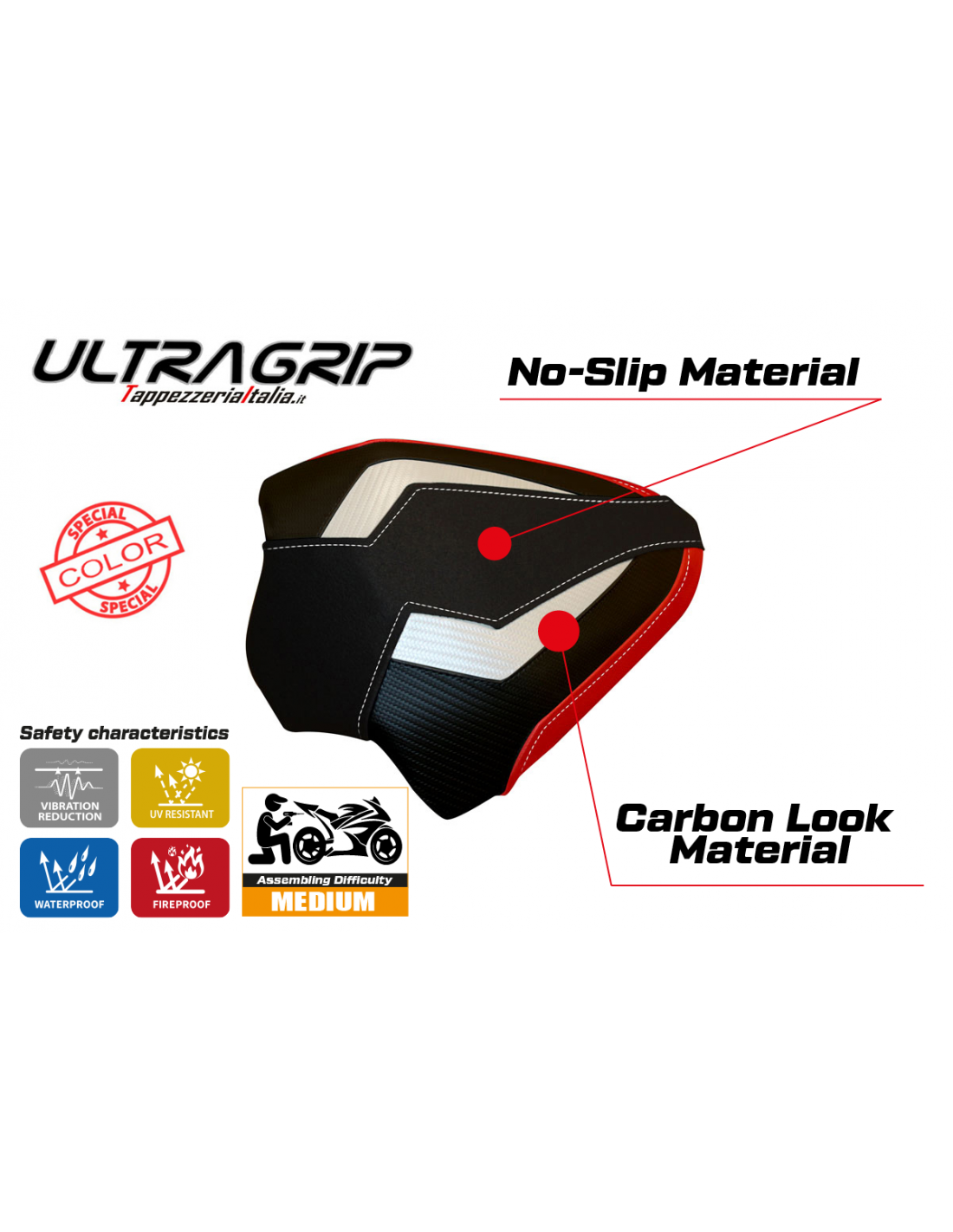 Il rivestimento UltraGrip è realizzato con una superficie estremamente ruvida al tatto, studiata per ridurre al minimo lo scivolamento del pilota sulla sella. Questo è particolarmente utile in accelerazione, frenata e nelle curve, garantendo una posizione più stabile e sicura sulla moto.